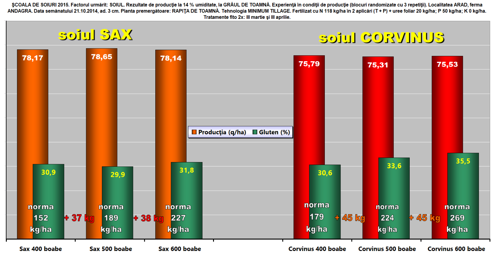 Au fost semănate soiurile Sax şi Corvinus, fiecare la câte 3 densităţi: 400, 500, 600 b.g./m.p.